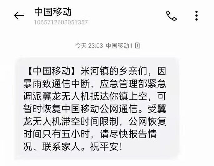 “【中国移动】米河镇的乡亲们,因暴雨致通信中断,应急管理部紧急调派翼龙无人机抵达你镇上空,可暂时恢复中国移动公网通信。祝平安!”一条来自中国移动的短信截图,刷屏了网络,让全国人振奋点赞,直呼“黑科技来了!给力!加油!”