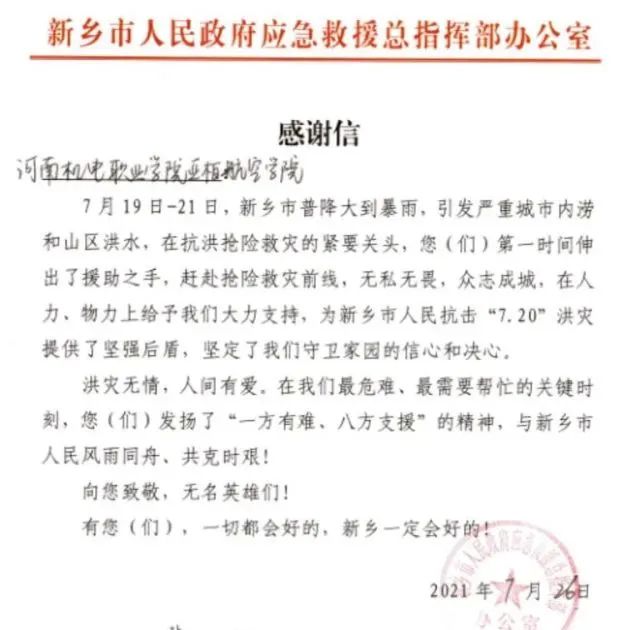 河南多地因极端强降雨造成严重洪涝灾害,对人民群众的生命财产安全造成了严重的危害。面对灾情,河南机电职业学院航空学院与合作企业郑州亚柏智能科技有限公司联合,由无人机专业全国知名专家胡延霖教授亲自牵头,组建“无人机应急救援志愿服务队”,充分利用校企双方在无人机专业人才、技术、设备等方面的优势,发挥无人机在灾情巡查方面的独特作用,在这场保护人民群众生命财产安全的抗汛救灾战争中发挥了不可替代的作用。
