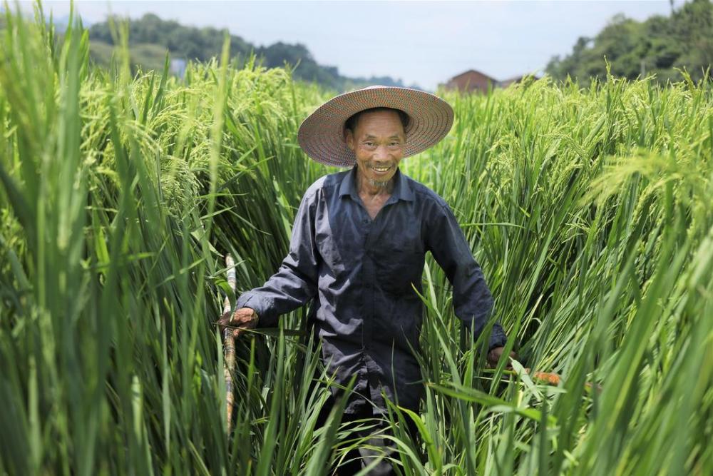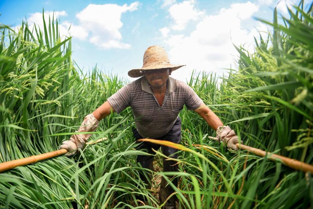 制种农户在稻田中扬花授粉