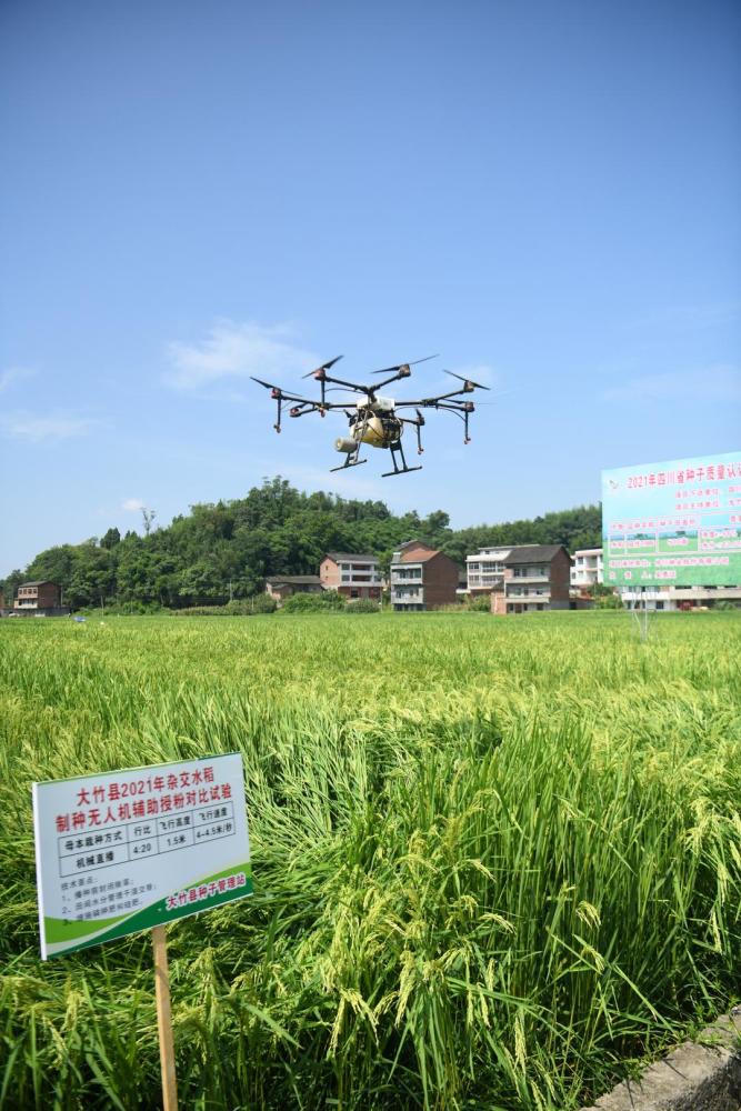 三伏天,是水稻扬花授粉的黄金期。7月27日,在四川省达州市大竹县高明镇杂交水稻制种示范基地,种农抢抓好天气,顶着烈日在稻田里忙碌,采用无人机为水稻“吹风扇”,辅助水稻扬花授粉。