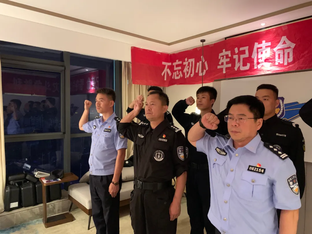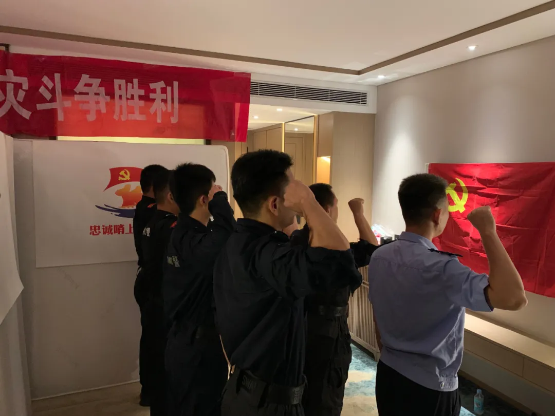 工作组临时党支部组织全体参战人员集体宣誓,并传达副市长、德州市公安局局长邵浩浩的指示精神。“党旗是我们提前准备好,一路带过去的。宣誓的时候,看着鲜红的党旗,想着这一天看到的灾情,想到受灾的群众,觉得身上这身儿警服格外有分量。”工作组组长、特警支队副支队长张松表示。“我们都盼着河南的灾情能够尽快好起来!”工作组成员、“飞鹰”警航中队中队长李明说。