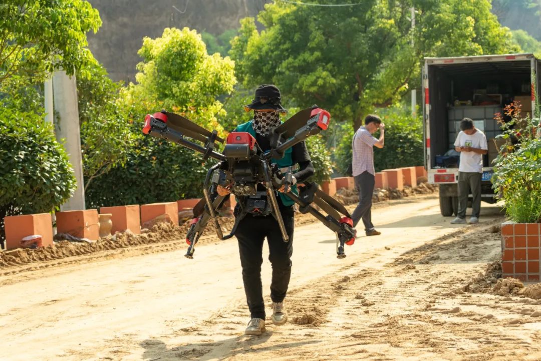 防疫消毒支援队到达首站灾区村——郑州市二七区樱桃沟村后,迅速投入工作。队员们首先利用极飞遥感无人机进行了三维遥感测绘,生成村庄高清数字地图,便于极飞农业无人机进行全自主、精准、高效防疫消毒作业。
