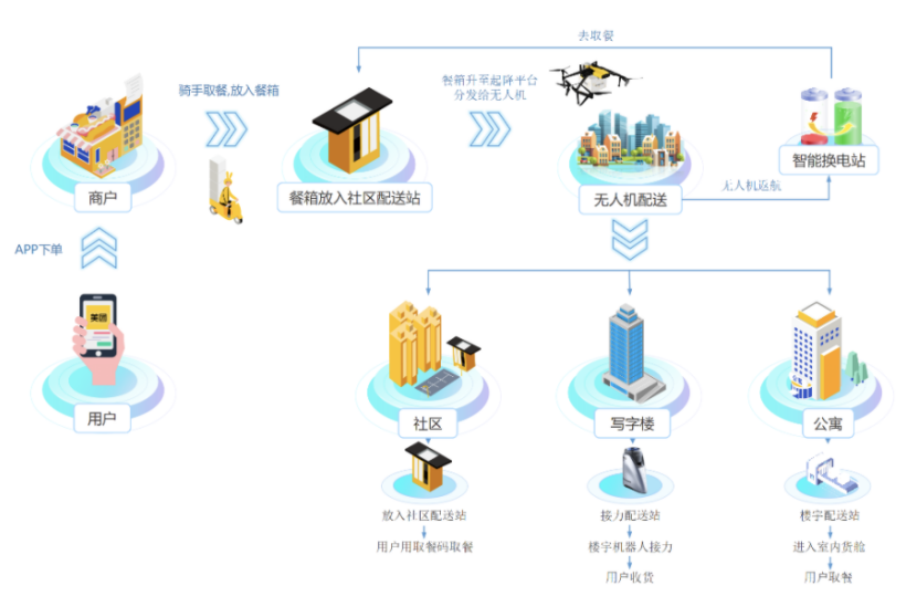实际在订单配送过程中,依托的城市低空物流网络,由人机协作完成。按照美团的这套人机协同配送方案,具体步骤是,消费者下单后由骑手取餐送至“自动化机场”,再由无人机取餐后转送至消费者附近的“自动化机场”,最后由骑手或智能楼宇配送系统完成配送,也可能是消费者到定制区域自行取餐。