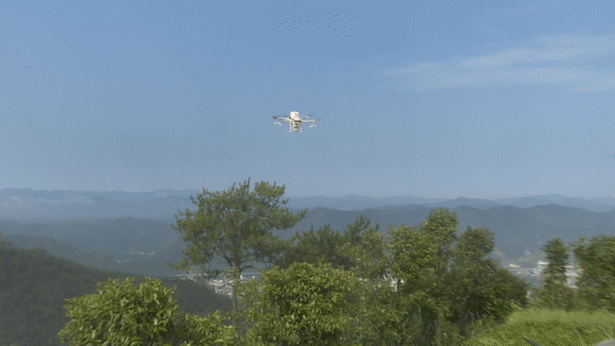 湖北箱源丰生物科技有限公司现场作业的负责人曹正伟告诉我们,此次飞行用的是大疆T20的无人机,最大载重40公斤,飞行半径一公里。