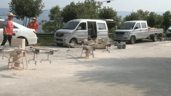 在现场,施工作业单位湖北箱源丰生物科技有限公司出动了两架大功率无人机, 按照配药、换电、起飞、喷洒、航点飞行、降落的流程,进行多次作业。