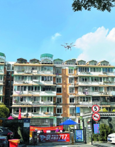 无人机在思园上空盘旋“喊话”,对居民进行防疫宣传。 企业供图