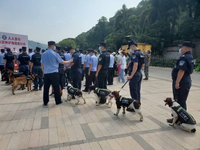 8月2日上午,天河区2021年禁种铲毒踏查行动举行。现场出动了无人机进行航测、缉毒犬搜毒和居民群众踏查,深入山区林场、废弃庭院等潜在非法种植区域,进行全面、不留死角的踏查铲毒行动。