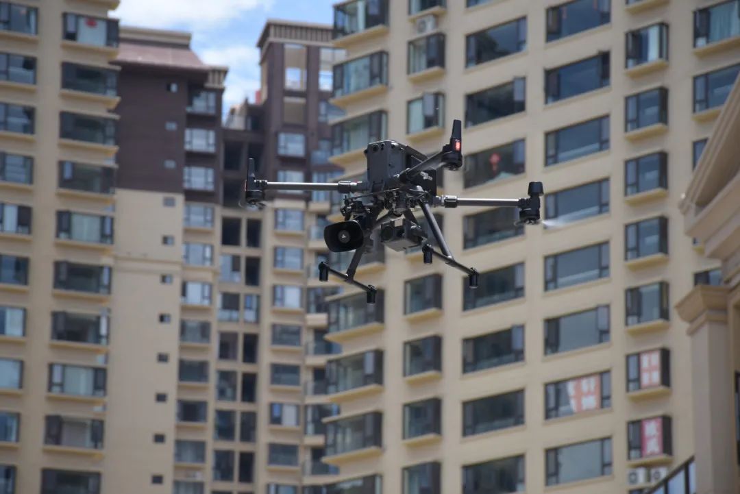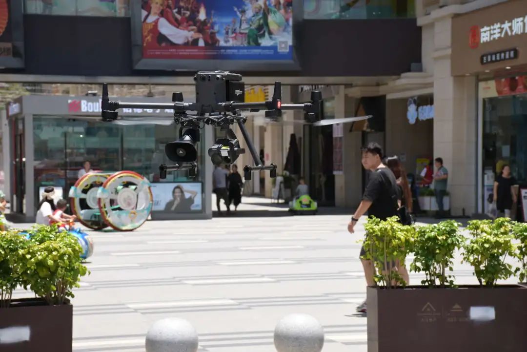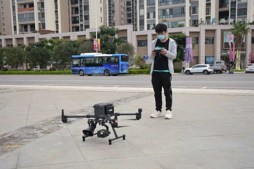 在不远处,记者见到了正在执行飞行操作的工程师鞠晓亮。“无人机一次可飞行30分钟左右,可配合多组电池执行长时间飞行任务。”他介绍,无人机广播效果可覆盖周边15公里左右。根据其机动性强的特征,能在多种场景下实现及时、定向的信息传递。同时,在防疫工作中除了能减少不必要的接触外,还能引起市民关注,起到良好的防疫宣传效果。
