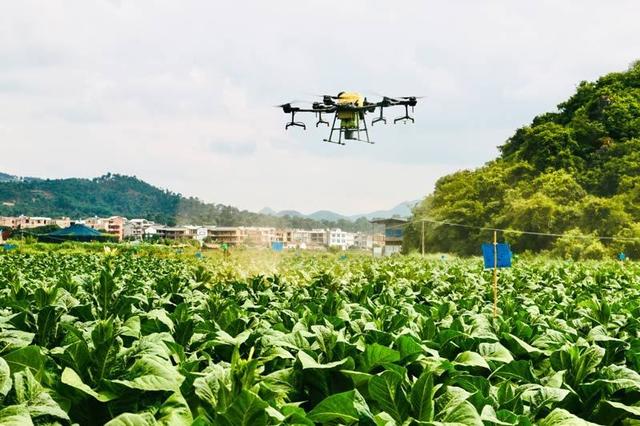 暑气蒸腾,草木葳蕤,炙热的阳光掠过山间。云南省文山壮族苗族自治州广南县珠琳镇吊井村王光兴的地里,无人机正热火正朝天的作业中,为50亩烟地喷洒杀菌药和叶面钾肥,短短不到2个小时就完成了。