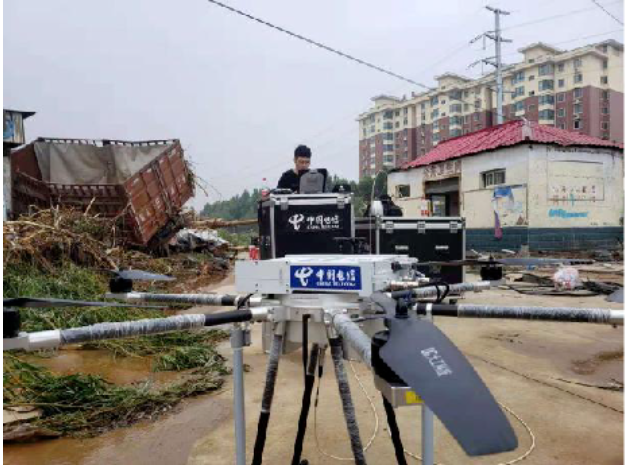 2021 年 7 月 22 日 23 时,中国电信湖北机动通信局第二梯队 11 名突击队员携带系留式无人机基站、背负式基站等 23 台/套应急装备抵达郑州市。第二梯队到达米河镇后,迅速利用 Ka 卫星便携站开通系留式空中无人机基站,使米河镇灾区的通信得到全面恢复。