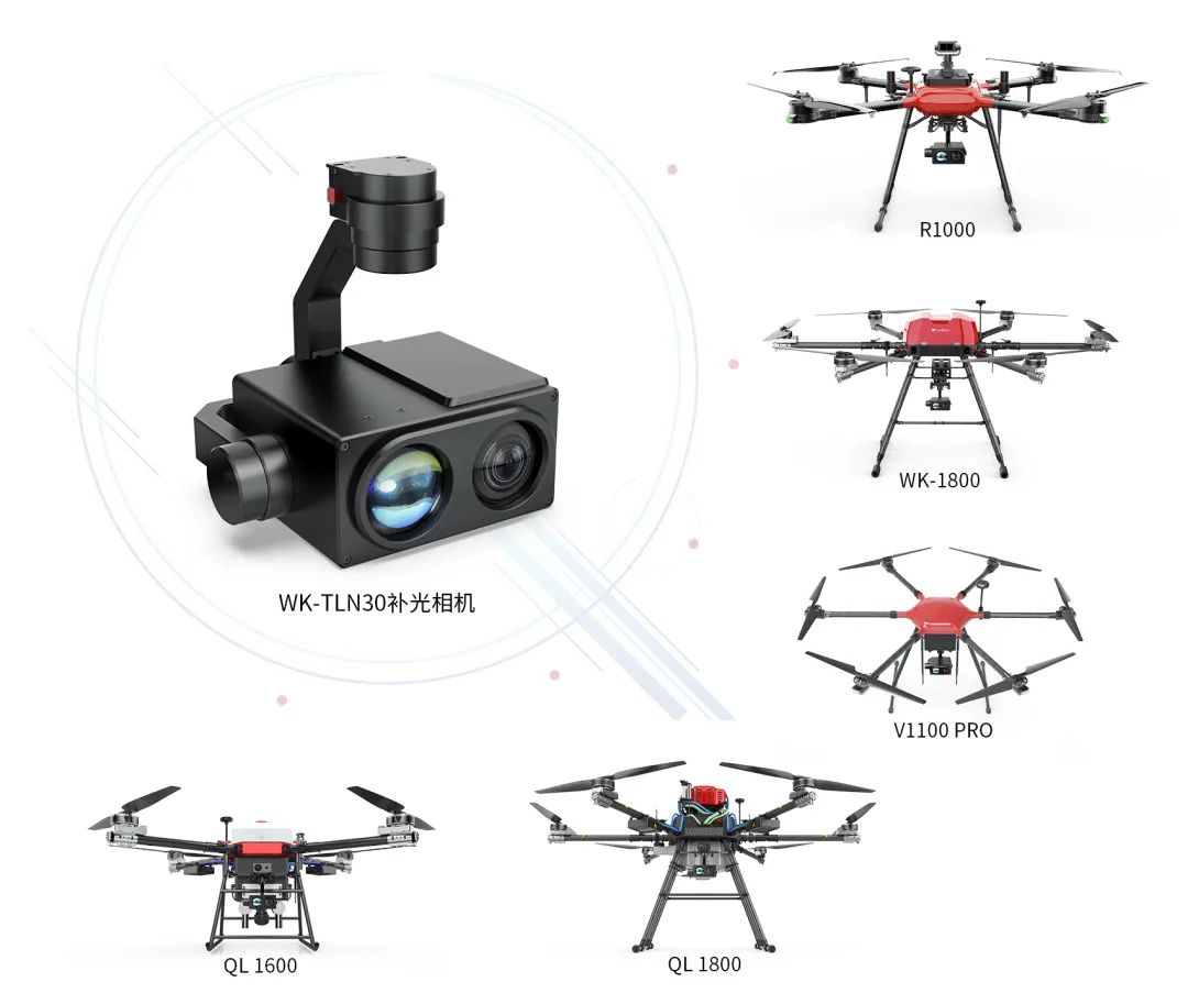 WK-TLN30激光补光相机适合华科尔多款飞行平台,包括R1000、WK-1800、V1100PRO、QL 1800、QL 1600等机型。