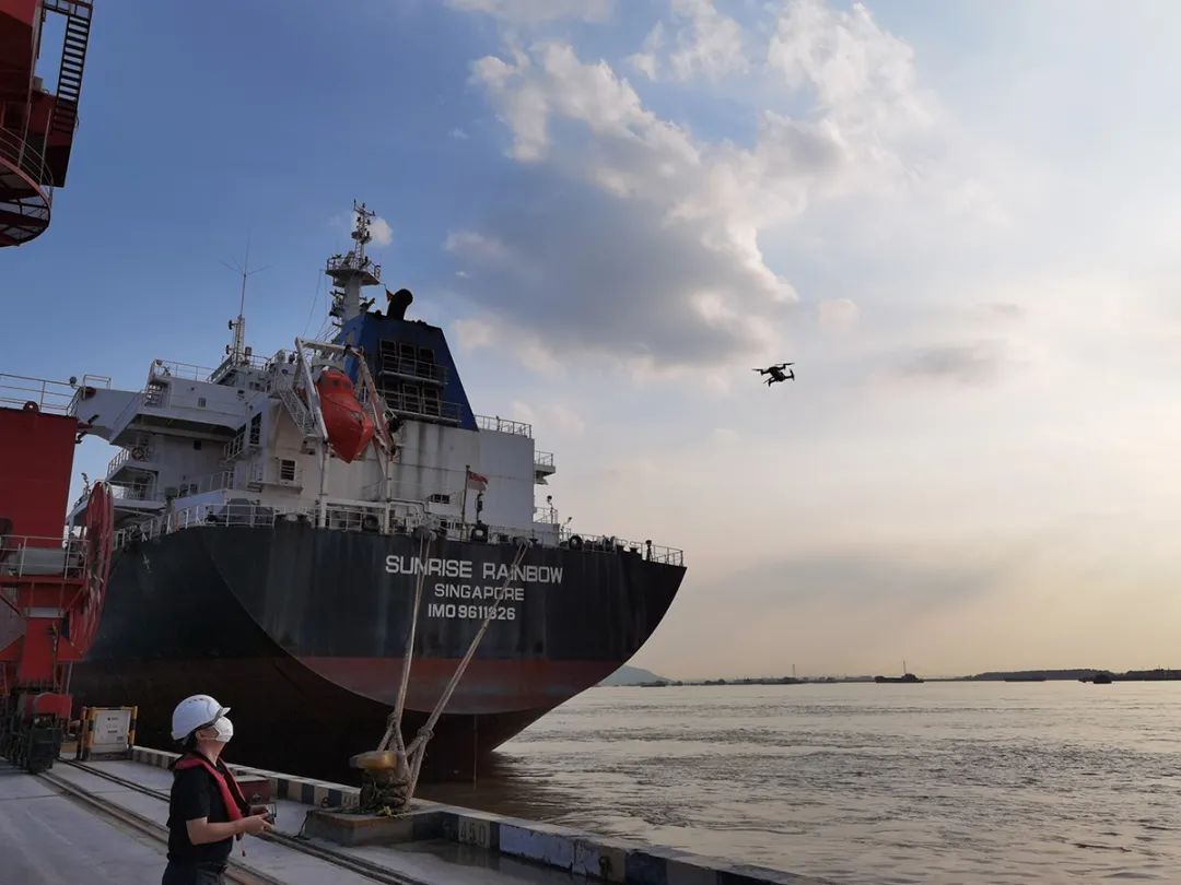 在龙潭港天宇码头,南京公司检验员操作无人机对停靠的“SUNRISE RAINBOW”2万吨铵货轮进行水尺检测。“SUNRISE RAINBOW”轮是南京公司将无人机技术用于水尺重量鉴定的第一船。