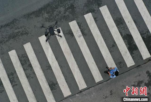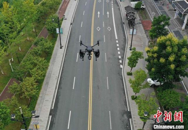 无人机对城区道路等进行巡查。 吴勇兵 摄