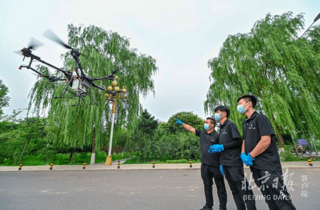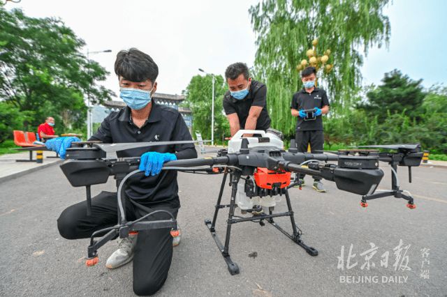 2020年以来,吴海宁(中)和同事们共同组成一支无人机消杀团队,为延庆上百个村庄进行了防疫消杀。