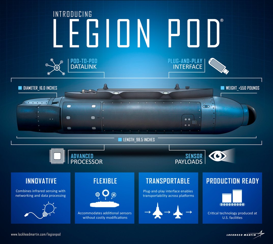 为了克服这一问题,洛克希德·马丁开发了Legion Pod,该Pod已经跟F-16和F-15C战斗机一起飞行。这种98.5英寸长(2.5米)和16英寸宽(41厘米)的外罩使用无源IRST21传感器取代了主动雷达,该传感器具有先进的机载数据处理功能,它可以通过探测红外辐射来跟踪和跟踪目标。