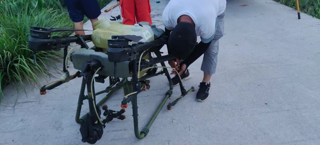 现场发现,无人机悬挂位置正好在水田中间上方,距离大道十来米,机翼交叉插入电线之间,消防车伸缩臂无法施展,经飞控手介绍,无人机净重达30公斤重,指战员所要开展的方向正好是斜上方,给救援带来重重困难。在联系供电局采取停电措施后,消防人员将绳索套在绝缘杆上将无人机脚架套住,向近靠电线杆一侧拉近,通过二节拉梯上到电线杆顶端,解开无人机套住的地方,再用单杠梯、绳索、绝缘杆、固定杆将无人机固定防护后将无人机取下交给飞控手。