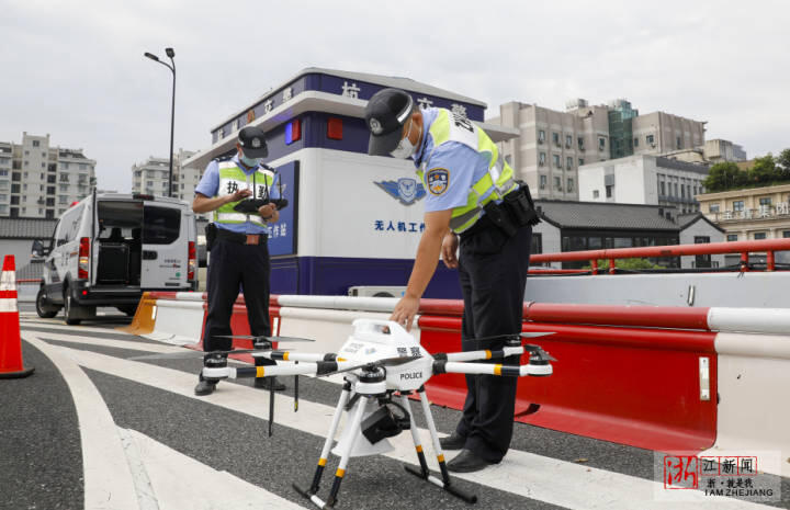 8月31日,杭州中河高架上几位交警正在操作无人机查看高架交替通行的情况。
