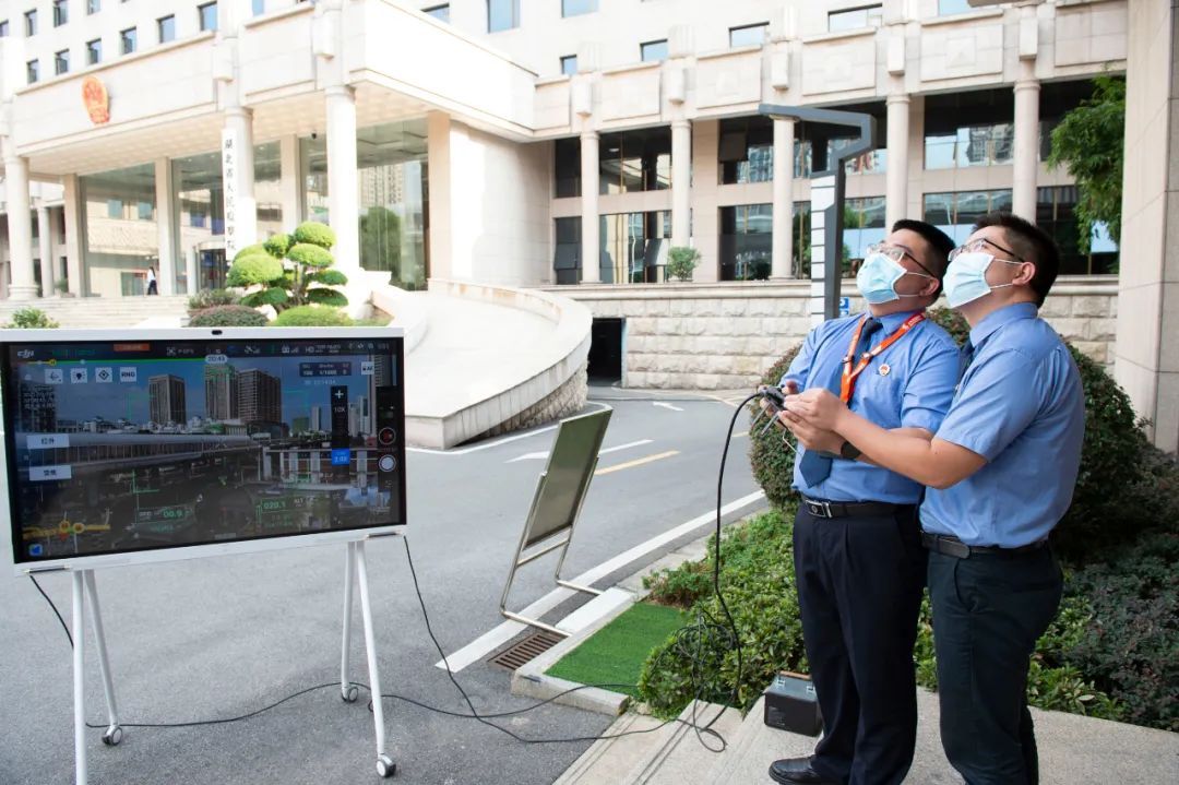 随后,在省院机关大楼前,技术人员向检察官们展示了无人机飞行表演,模拟公益诉讼案件中涉及的无人机航拍污染水域、违法建筑和山体破坏场景,通过无人机对目标物进行方位、概貌、重点部位及细目拍摄取证。让检察官们更直观的感受到当前检察业务亟需依靠现代科技,来提升公益诉讼线索发现、调查取证的办案效率。