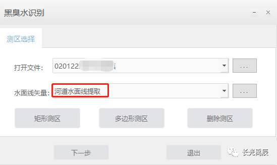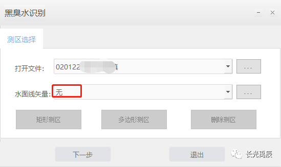 图3 黑臭水计算模块2.测区选择根据提取与计算要求手动选择测区范围,若无特殊范围要求,该步骤可跳过,软件将自动计算全图结果。同时若在使用黑臭水模块前未使用水面线提取模块输出结果,则在选择“水面线矢量”任务栏下选择“无”。