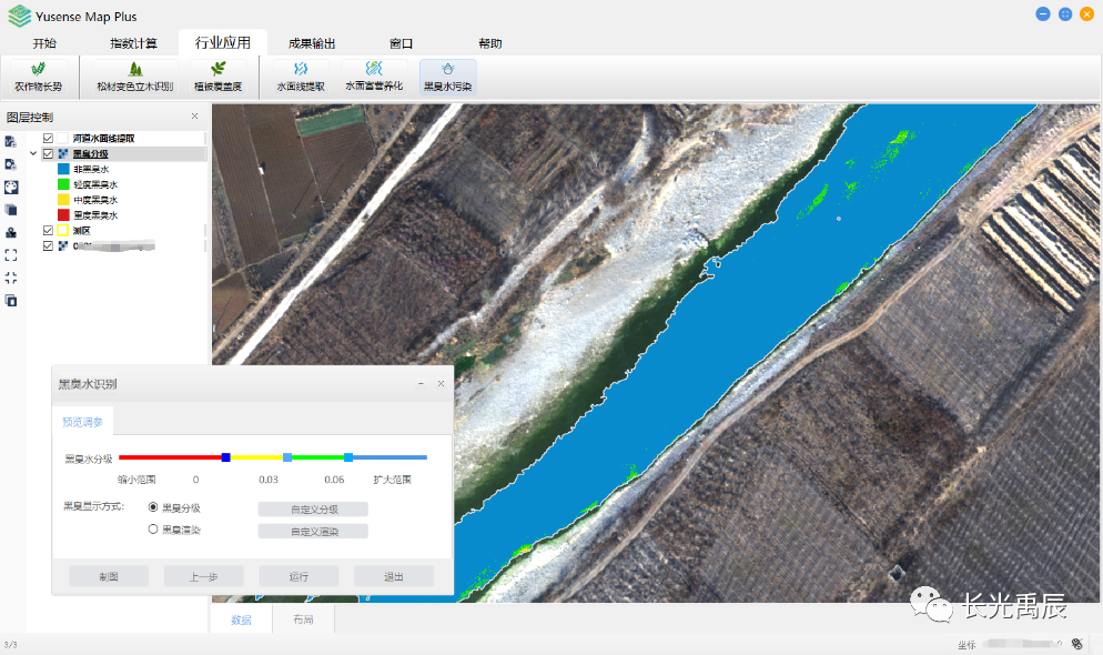 黑臭水监测的核心功能为水面范围提取与水体黑臭程度计算,Yusense Map+的水体黑臭程度计算模块操作步骤如下: