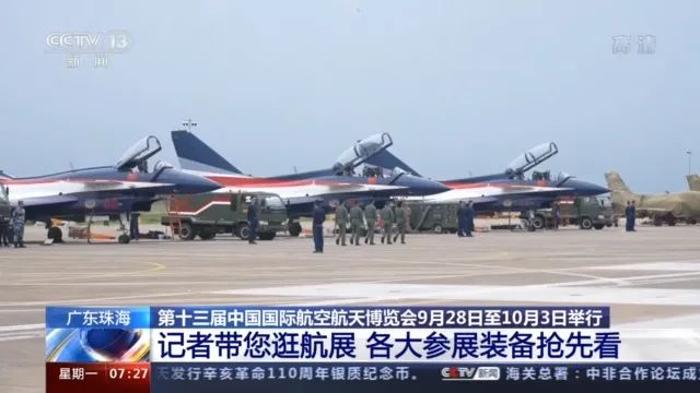 下午“红鹰”和“八一”队分别进行了表演,“红鹰”飞行表演队分为两个编队起飞,在空中汇合后,分别以8机和6机编队的形式,依次完成了八机钻石筋斗、横滚等一系列动作。随后“八一”飞行表演队的6架歼-10飞机起飞,分别完成了六机三角形编队飞行、双机对冲等动作。总台央视记者 崔霞:“八一”飞行表演队,马上双机对飞,太漂亮了,这也是“八一”飞行表演队在本届航展首次进行适应性的飞行演练。记者带您逛航展 各大参展装备抢先看目前,所有参展的各大装备都已经准备就绪了。都有哪些重大装备将参展呢?总台央视记者 崔霞:第十三届中国航展可以说是开展在即,目前所有的装备是悉数到场,准备就绪了。