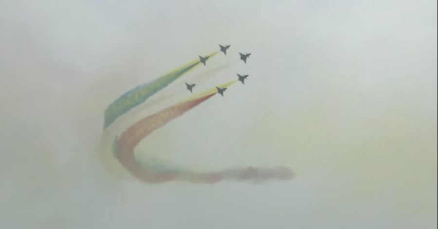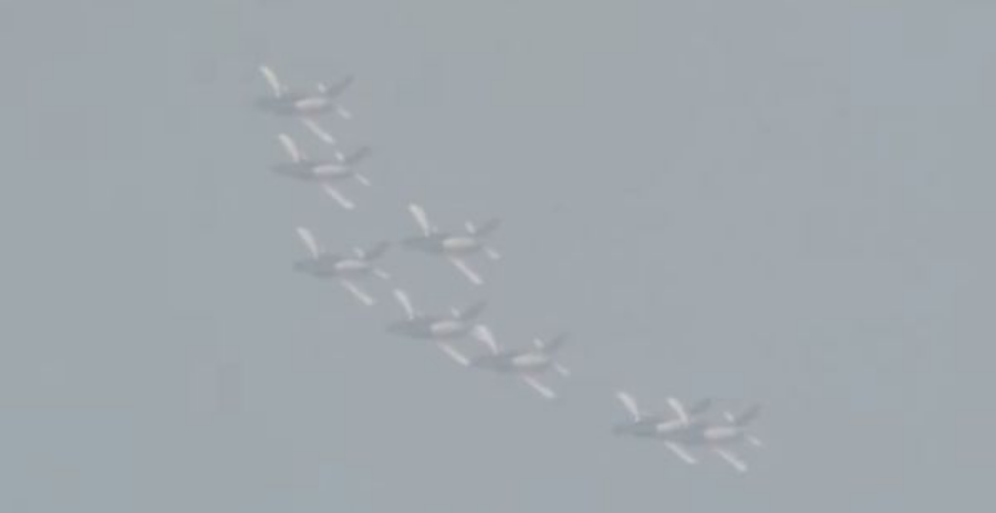 【11:15 】空军红鹰飞行表演队8机编队升空,该表演队是由空军航空大学飞行教官组成,代表解放军空军飞行员的技术最高水准。该飞行队在空中不断变换红鹰、战鹰、标枪等队形。