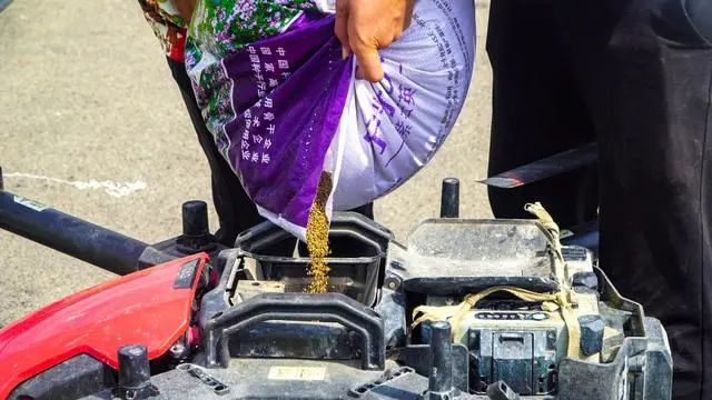 “无人机的效率很高,最多可以装70斤左右的种子。一般一天我们可以完成300至400亩土地的播种”。无人机飞手吴林通介绍道,现在用的这款极飞P80植保无人机是今年推出的新款,可以根据规划的路线进行自动播种,具有播撒密度均匀、作业范围大、性能稳定等特点,与以往传统的人工播种相比,效率足足提高了30多倍。