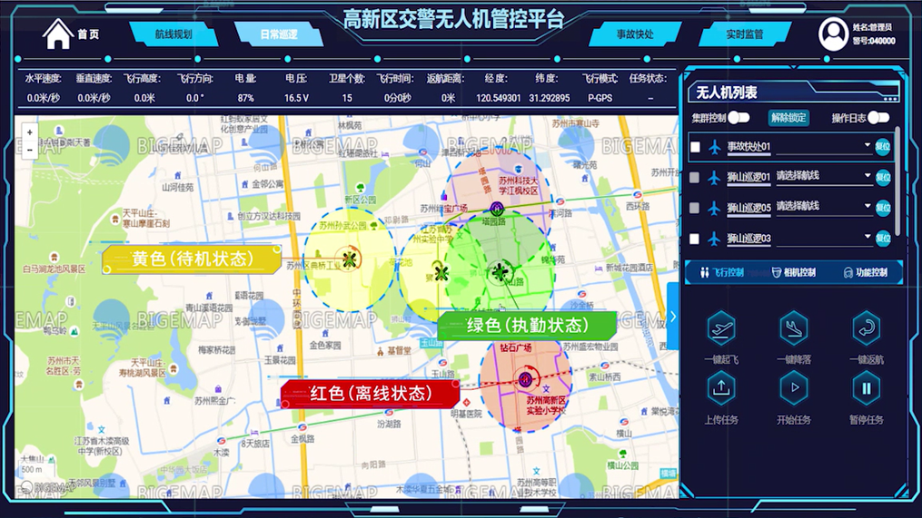 通过无人机三色勤务可视化监管实时状态,开创“无人机+铁骑+网格+警格”的新型勤务模式。