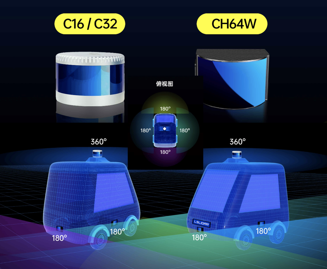此方案采用镭神智能机械式激光雷达C16/C32安装于车顶,水平扫描角度360°,车身四周各安装一台车规CH64W激光雷达,可实现360°水平无死角环境感知与数据采集,且具有低成本优势,适用于低速无人车等应用。