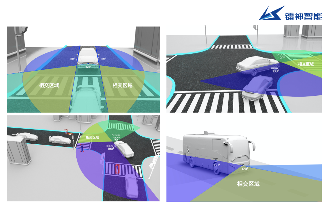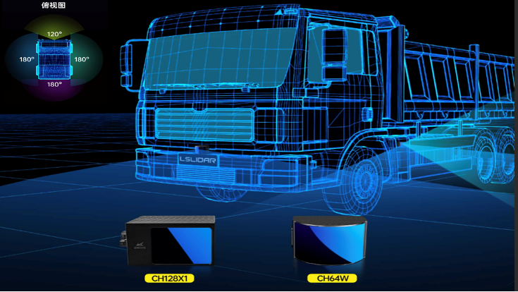此方案采用镭神智能车规级128线混合固态激光雷达CH128X1作为主雷达,探测距离可达200m(160m@10%),左右方及后方安装3台CH64W补盲激光雷达,两者搭配均可满足车规级设计标准,适用于智能驾驶环境感知与辅助决策,解决视觉盲区安全问题。