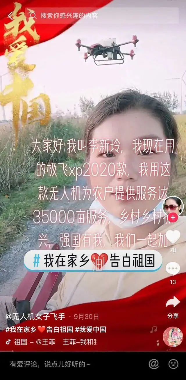 无人机在作业时,李新玲也会用农田作背景玩玩自拍,用上美颜滤镜,配上热榜音乐,有时能收获不少点赞。