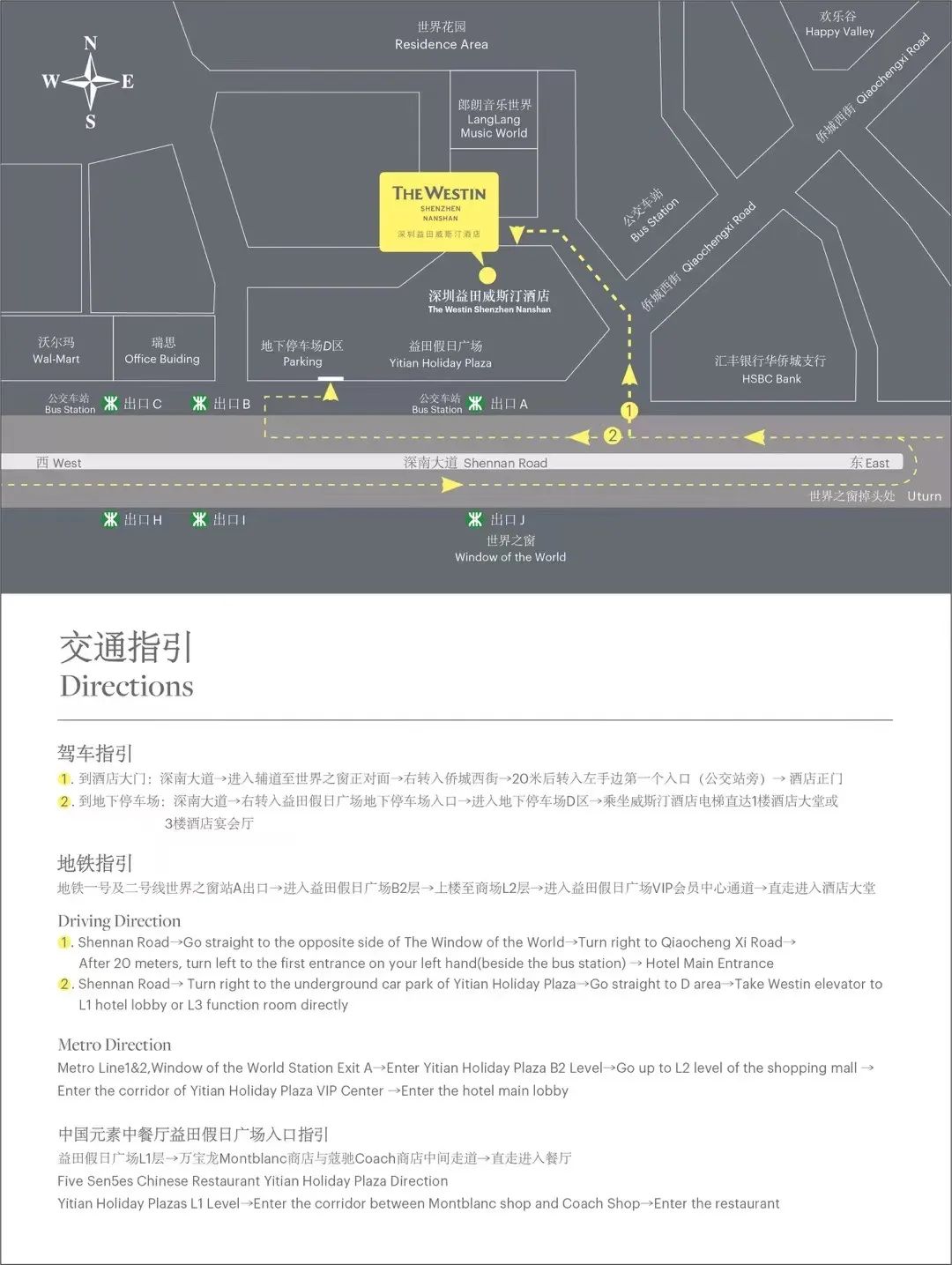 ✈ 如自驾可沿深南大道往宝安方向进入益田假日广场地下停车场负三楼D区,乘坐威斯汀酒店专用电梯间直接到3楼宴会厅。