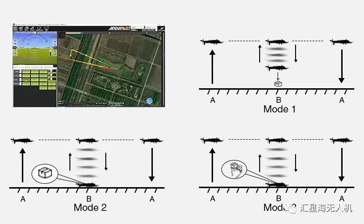 该飞机的异地起降功能支持无人和有人取货,货物送到后飞机自动返航。前两种模式分别为空中悬停投放和飞机落地自动投放,当你在目的地取货时无需人为操作。第三种模式仅需在飞机降落后按下按钮取物,再长按按钮,十秒钟后飞机自动返航。全过程简单易操作。在异地起降前需在地面站规划航线。