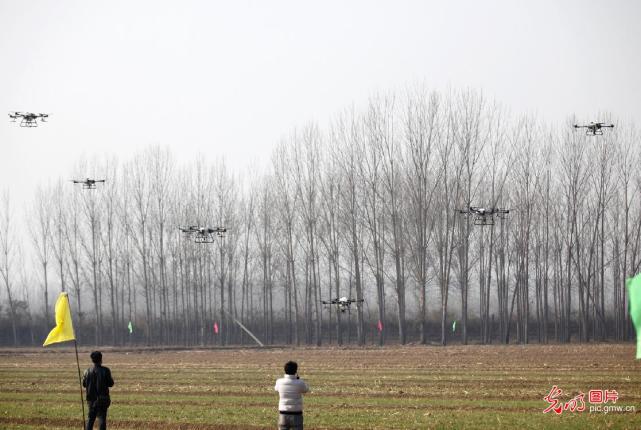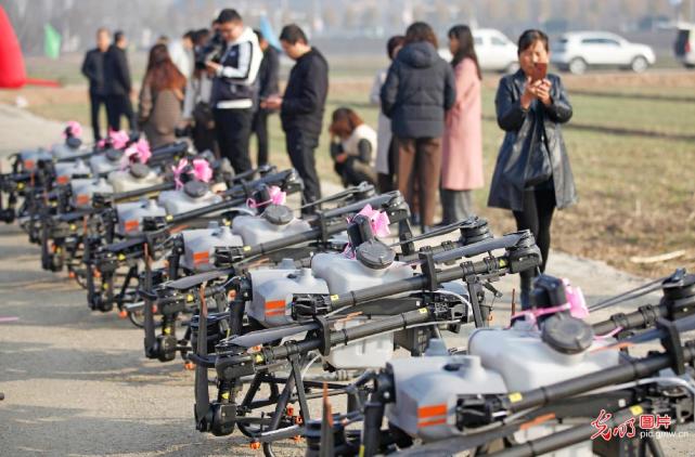 2021年11月19日,在山西省临汾市襄汾县邓庄镇燕村高标准农田示范基地,农机部门为农户集中发放植保无人机。当日,当地农机部门将10台植保无人机发放给农户,帮助农户推进农作物病虫害防治向科学化、规模化、集约化发展,增强现代农业综合生产能力。(李现俊摄/光明图片)