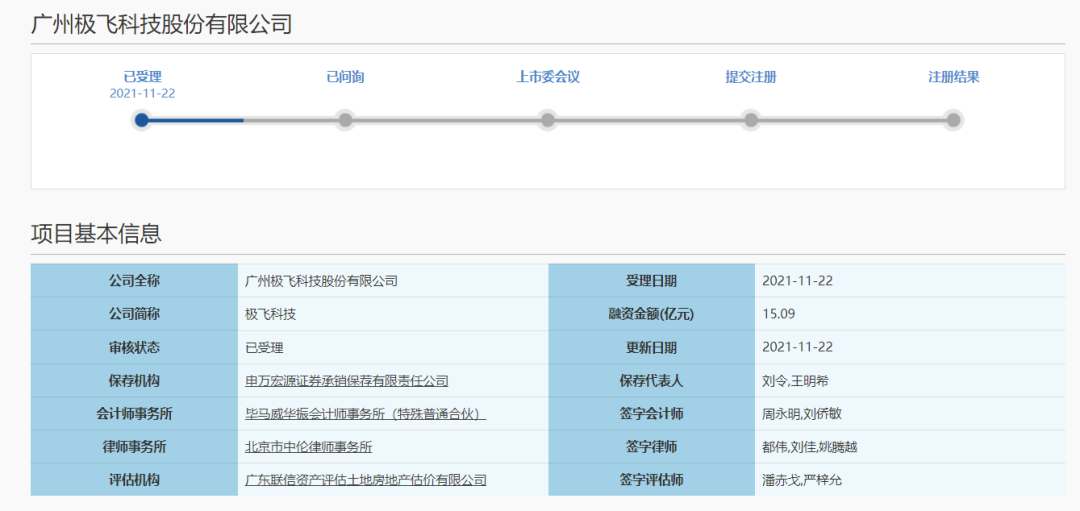 日前,广州极飞科技股份有限公司(简称“极飞科技”)科创板上市申请已获受理。申万宏源证券为保荐机构。拟募资15.09亿元。本次拟公开发行股票数量不超过6,001万股,不低于公司发行后总股本的15%。本次发行全部为新股发行,公司原股东不公开发售股份。