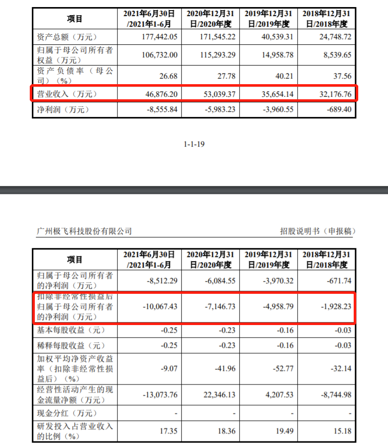 财务数据方面,根据招股书,极飞科技在2018年-2021年1-6月(下称:报告期),实现营收分别为3.22亿元、3.57亿元、5.3亿元、4.69亿元,同期净利润分别为-671.74万元、-3,970.32万元、-6,084.55万元、-8,512.29万元。扣非后净利润分别为-1,928.23万元、-4,958.79万元、-7,146.73万元、-10,067.43万元。
