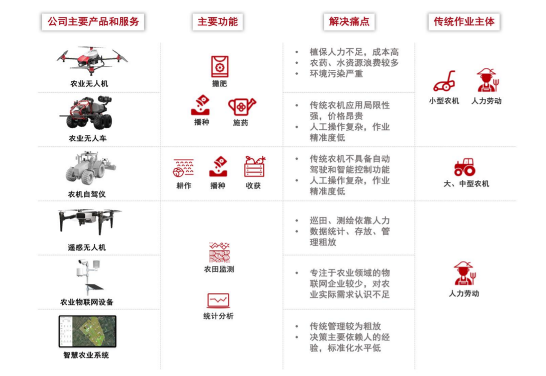 公司主营业务包括研发、制造并销售农业无人机、农业无人车、农机自驾仪、农业物联网设备等在内的智能农业装备和智慧农业管理系统,并提供相关技术服务。