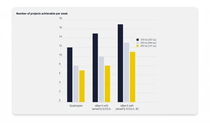 下面,最近比较 100 公顷(247 A)任务的测绘时间的测试结果表明, 由于其效率,带有 SODA 3D 传感器的 eBee X几乎比四轴飞行器快 2倍。