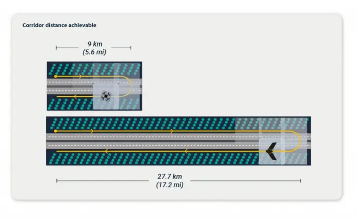 固定翼 eBee X 的飞行时间最多可延长 3 倍,最多可映射约18.7 公里/11.6 英里 。 相比之下,典型的四轴飞行器每个电池 9 公里(5.6 英里)的覆盖范围长 3 倍。这种差异可能使商业运营商能够参与更广泛的走廊项目,或者以高达 3 倍的效率绘制更大的走廊。