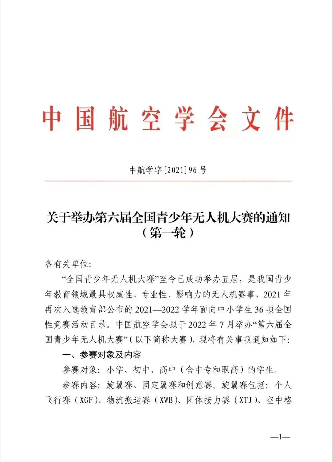 “全国青少年无人机大赛”是我国青少年教育领域最具权威性、专业性、影响力的无人机赛事,至今已成功举办五届,2021 年 再次入选教育部公布的 2021—2022 学年面向中小学生 36 项全国性竞赛活动目录。