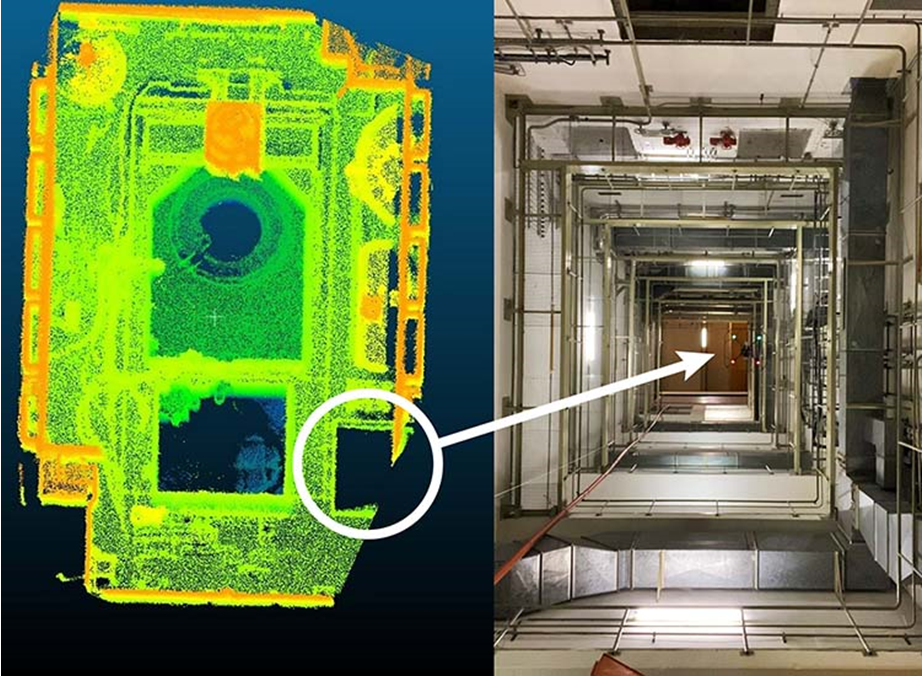左侧,激光雷达图像显示了无人机在安全壳入口上方盘旋时的视角。右下角的黑色矩形是通风井。没错,无人机飞进了通风井。辐射探测器在位于竖井中的红色管道中识别出钴 60。