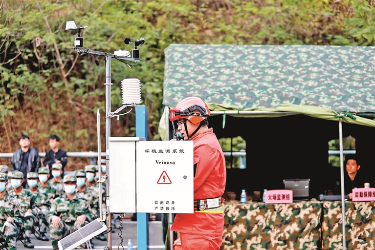 随着火势扩大,火场上空,无人机中队操作无人机绕林区周边飞行并喊话,引导和疏散人群,提醒无关人员远离火场。同时,移动气象监测站对火灾现场进行持续实时监测。
