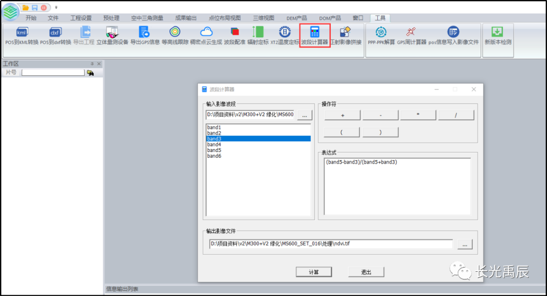 利用工具栏下波段计算器加载拼接后反射率数据进行典型光谱指数计算。本工具支持波段-波段、波段-数字、数字-数字间的四则运算。根据植被指数对应的公式,依次输入运算符,双击带入相应波段即可。