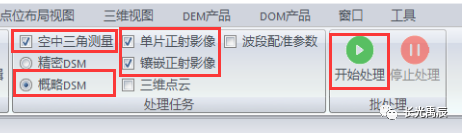 开始菜单栏下同时勾选“空中三角测量、概略DSM、单片正射影像、镶嵌正射影像”,点击“开始处理”确认拼接。