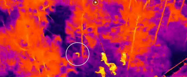 现场还有几位救援人员,大家原以为夜鹭行动能力受影响,准备用网兜去套住夜鹭,没想到它反应依旧灵敏,翅膀一扑就飞走了。可明显是受伤影响,夜鹭没飞几米,无法坚持,又落到了旁边的树丛里。和夜鹭玩“躲猫猫”?消防员们突然想起,无人机这时候不正好能派上用场吗?大家拿来机器,又怕无人机飞太近又吓到夜鹭,于是打开热成像模式,远远地开始在小区的树丛里寻找这只夜鹭。