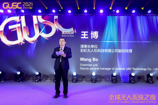 中国无人系统新技术产业联盟轮值理事长单位代表、彩虹无人机科技有限公司副总经理王博在中国无人系统“金翼奖”颁奖典礼上致辞