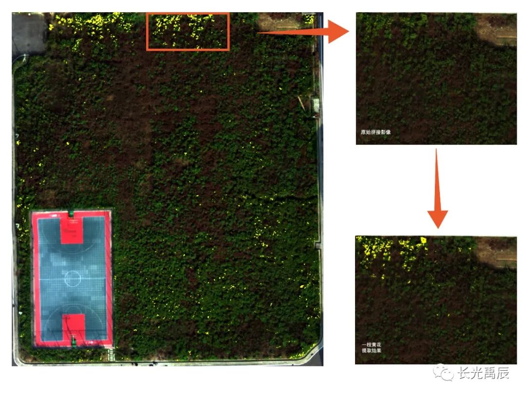 将所建立模型应用于其他航高拍摄的高分辨率光谱影像,亦可达到较好的提取效果。图8为20m航高的高分辨率多光谱影像中应用模型提取前后的结果,黄色部分为一枝黄花。