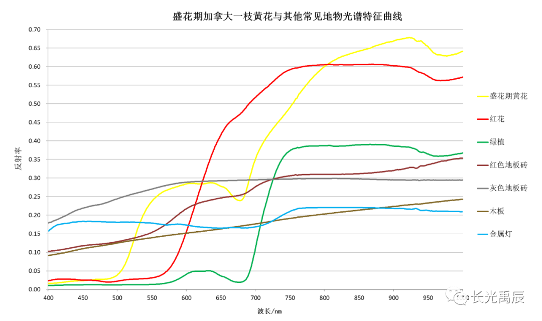 在近红外波段(760-1000nm)与正常绿植、木板以及人工表面有着较大的反射差异,一枝黄花的反射率明显偏高。