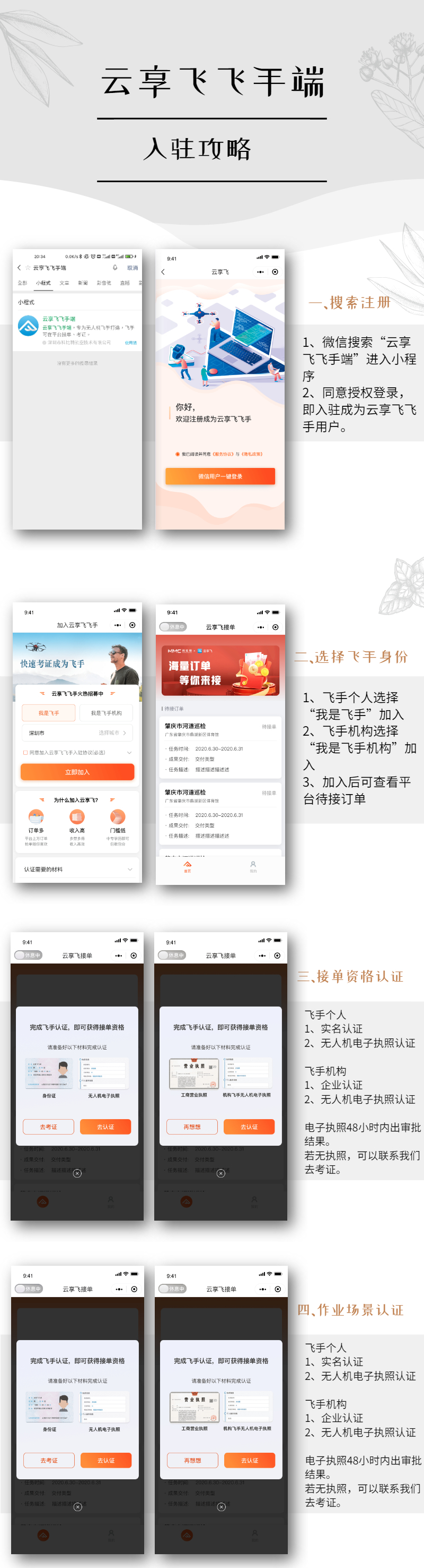 飞手可通过微信小程序【云享飞飞手端】注册登录,通过完成飞手资格认证后获得接单资格,云享飞平台会根据飞手及飞手团队擅长的飞行场景派单给飞手,在飞行服务作业完成后结算相应费用。