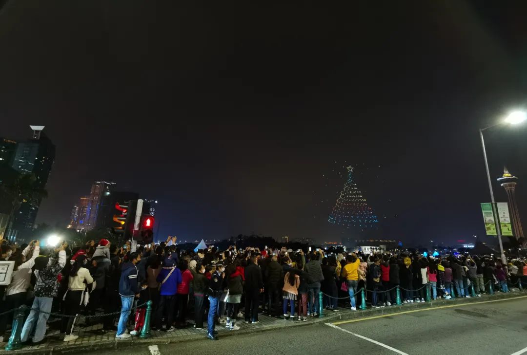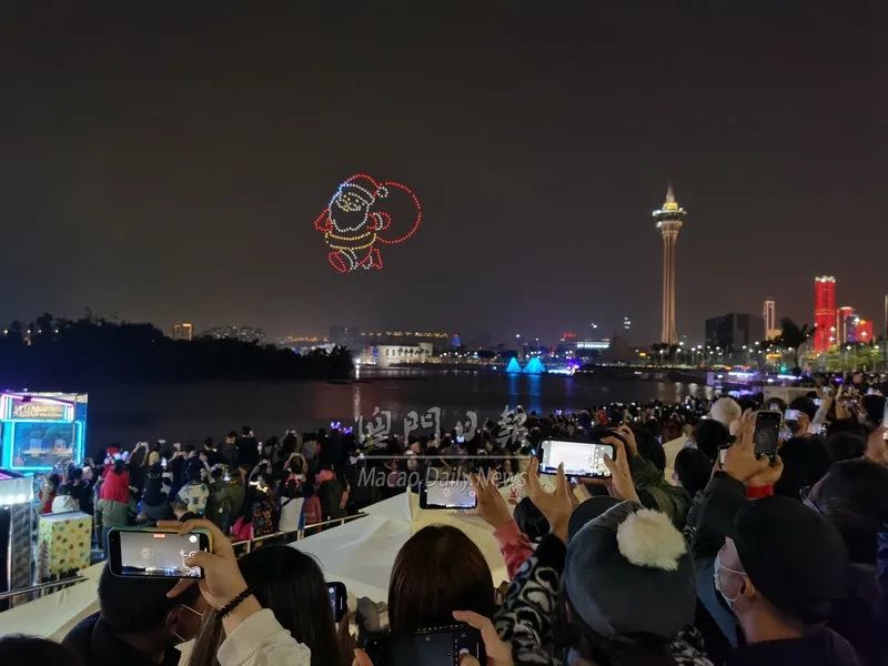 另外,“翱游澳门无人机表演盛会”最后两场次于圣诞夜压轴上演,由北京队演出“澳游圣诞”,吸引居民和游客到场观赏,观众挤满南湾雅文湖畔至大型白色帐篷靠湖一带,无人机队流光溢彩,点缀澳门夜空,幻化成赛车、圣诞老人和圣诞树等,精彩的演出让在场大小朋友呼声四起。
